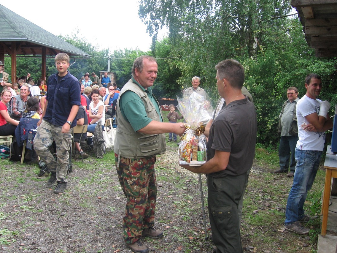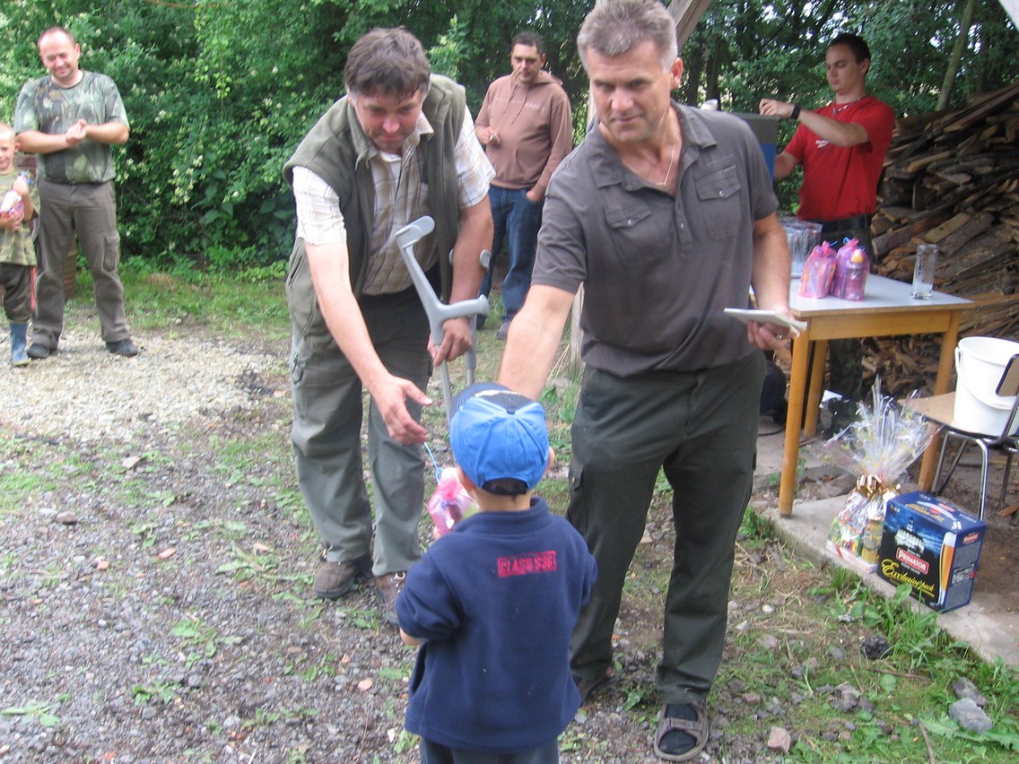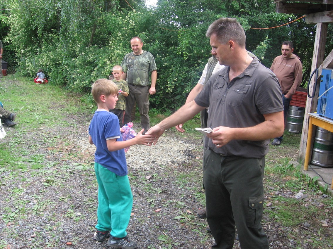 Jelikož jsme hlavním pořadatelem rybářských závodů, odpovídala tomu i cena pro vítěze. Po 15. hodině byla oficiálně ukončena soutěž v chytání a vyhodnocení tři nejúspěšnějších. Nejdříve, ale čtenáře upozorním na to, že kromě 32 startujících v kategorii dospělý, chytalo i šest dětí, bohužel těm dneska nebylo přáno ulovit nějakou rybku, proto si každý z nich odnesl balíček sladkostí na zlepšení nálady. To v kategorii dospělých bylo co počítat a po sečtení všech délek bylo možno vyhlásit pořadí na prvních třech místech. Na 3. místě se umístil pan Dohnálek s délkou nachytaných ryb 156 cm. Na druhém místě skončil pan Klapal Zdeněk s délkou 324 cm a hlavní cenu rybářského dne (srnce) si odvezl pan Štencar s celkovou délkou 363 cm.
