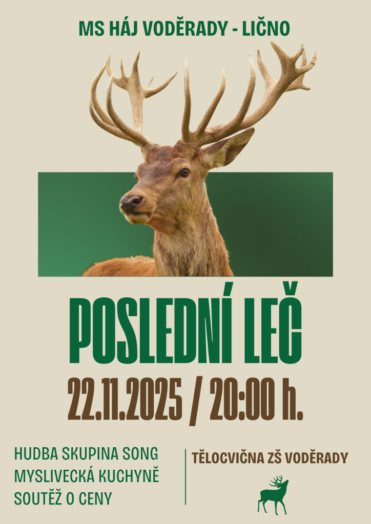 MS Háj Voděrady-Lično pořádá Poslední leč v sobotu 22.11.2025 od 20:00 h v tělocvičně ZŠ Voděrady. Hraje skupina Song